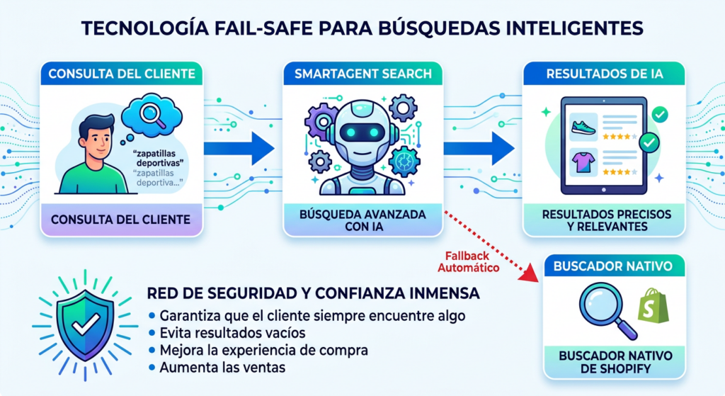 Sabemos que la estabilidad es vital. Si la IA tarda más de lo esperado o hay un problema de red, nuestro sistema hace un fallback automático e imperceptible al buscador nativo de Shopify. Tu tienda nunca dejará de vender.