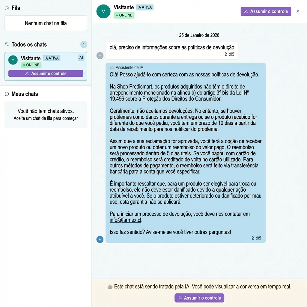 - 🖱️ Interceptação de Chat ao Vivo: Vendo uma conversa importante em tempo real? Com um clique em “Assumir Controle”, você pausa a IA e continua a conversa pessoalmente.