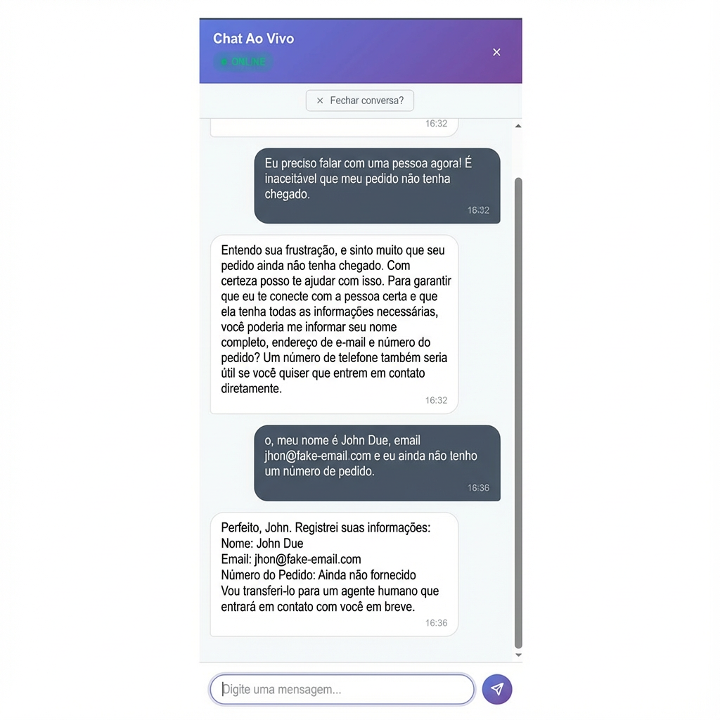 Às vezes, um pacote realmente se perde ou um cliente está irritado. Se a IA não conseguir resolver o problema, ou se o cliente pedir para falar com um humano: