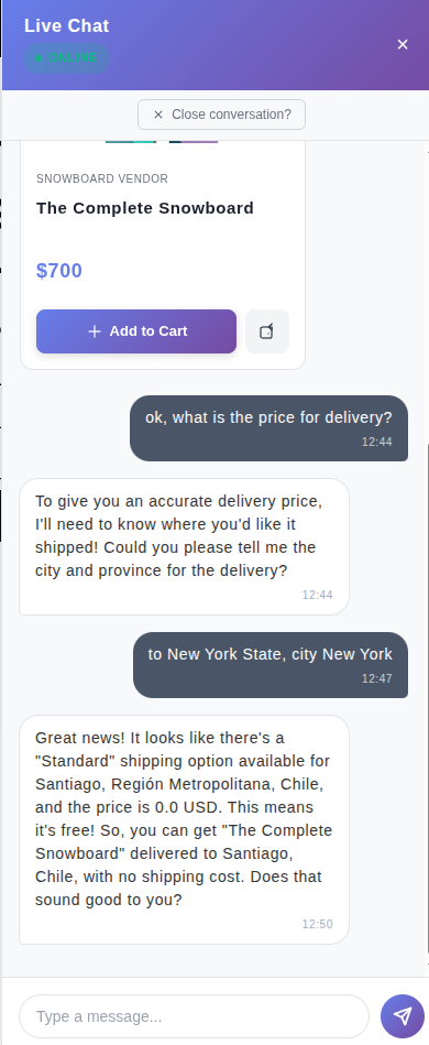 Customers can ask naturally: “I’m looking for a snowboard undes $1000” or “Show me running shoes”.
